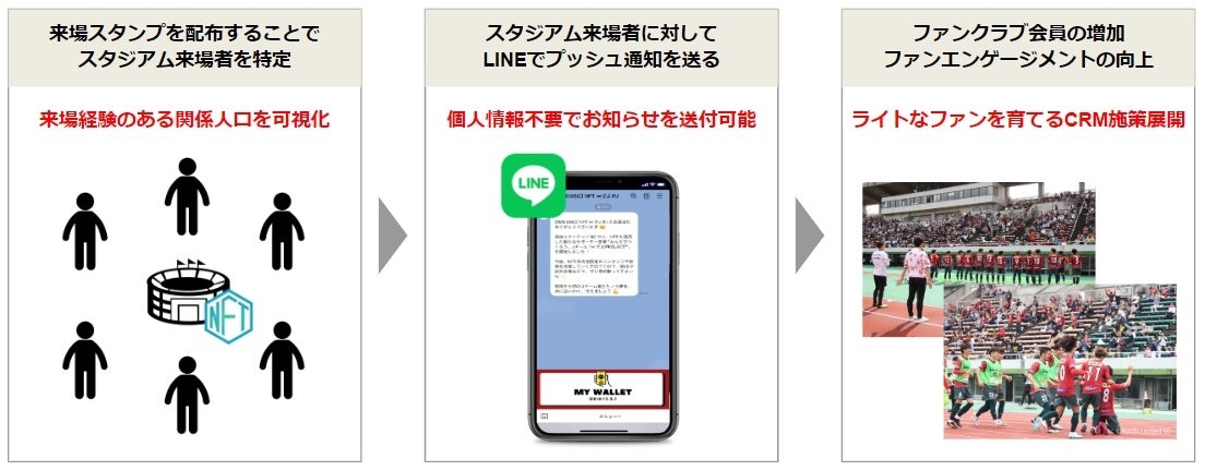 NFTを来場スタンプとして利用することで個人情報を取らない形で来訪証明を取ることができ、「スタジアムに定期的に来場してくれる関係人口」を可視化できます。また、来訪証明とLINEを繋げることで来訪者にプッシュ通知を送ることができるため、今まで接点を持てていなかった関係人口に対し限定情報や特典の配信が可能になります。この仕組みをCRMとして継続していくことで、ファンコミュニティを育成しファンクラブの増加やファンエンゲージメントの向上を目指します。