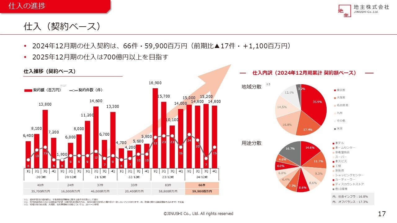 2024年12月期の仕入(契約ベース)は、66件・59,900百万円(前期比▲17件・+1,100百万円)となりました。2025年12月期の仕入は、テナント業種の多様化、事業エリアの拡大、土地のオフバランス提案といった成長戦略により、700億円以上を目指します。