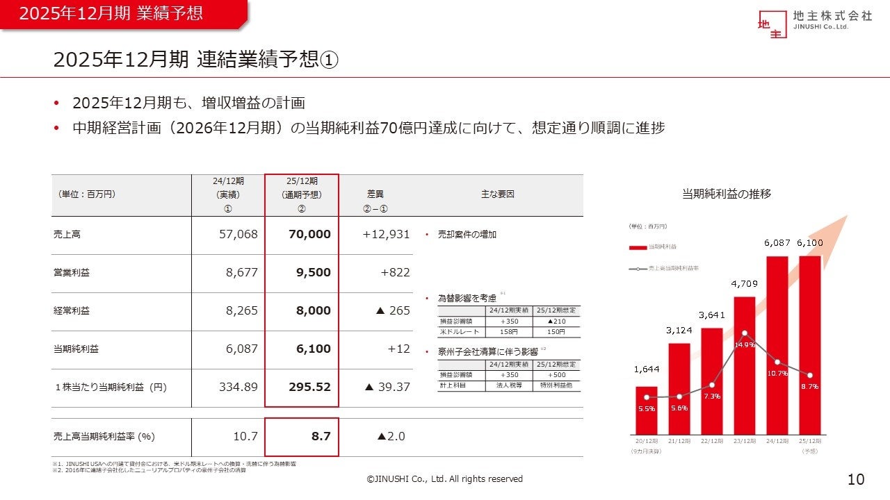 2025年12月期も増収増益の計画となっており、売上高70,000百万円(前期比+12,931百万円)、営業利益9,500百万円(同+822百万円)、当期純利益6,100百万円(同+12百万円)を見込んでいます。