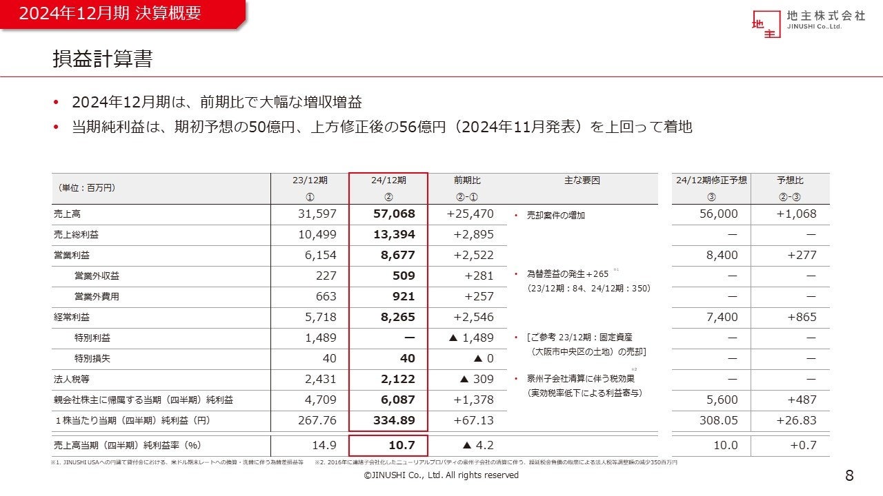 2024年12月期は、売上高57,068百万円(前期比+25,470百万円)、営業利益8,677百万円(同+2,522百万円)、当期純利益6,087百万円(同+1,378百万円)となり、前期比で大幅な増収増益となりました。