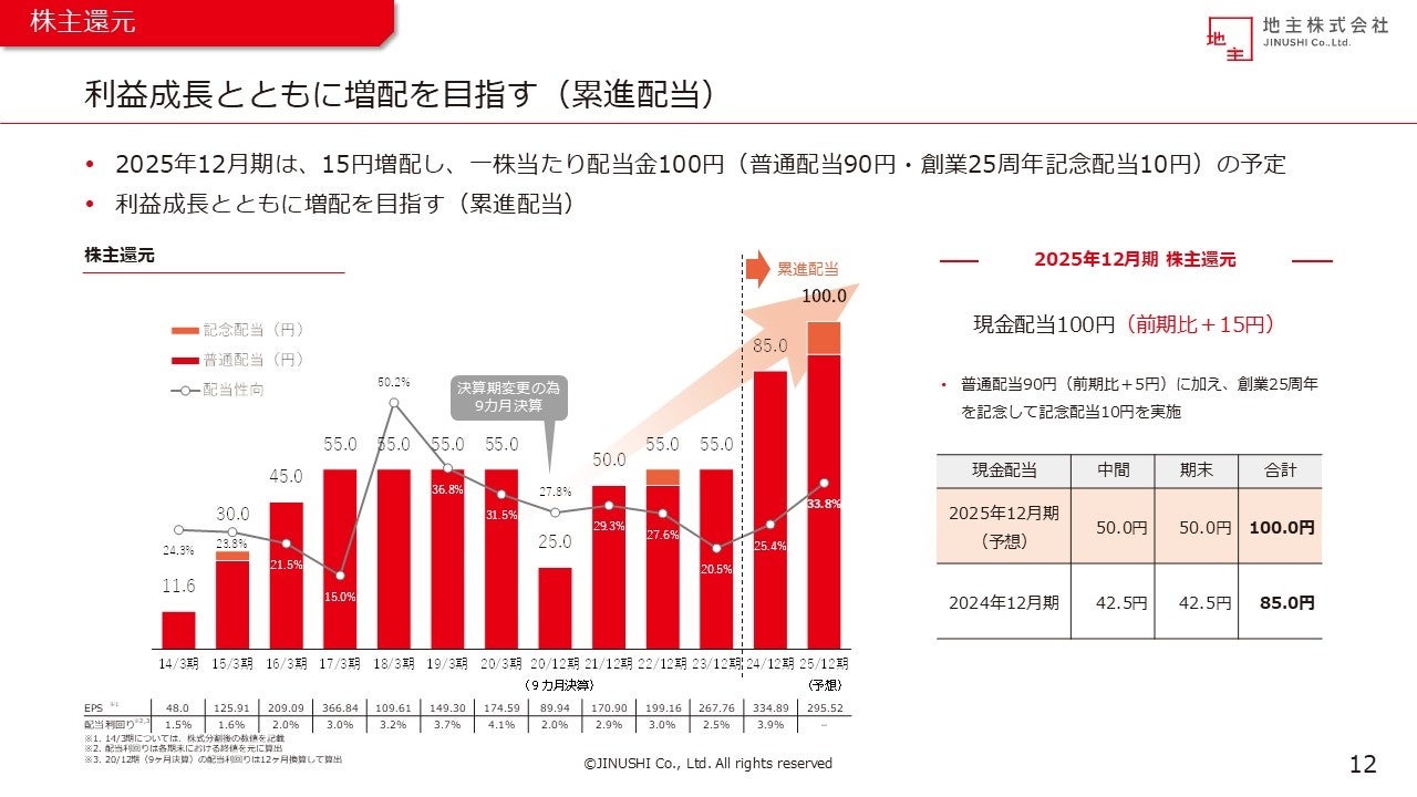 2025年12月期は、普通配当90円(前期比+5円)に加え、創業25周年を記念して記念配当10円を実施し、一株当たり配当金100円(同+15円)の配当を予定しています。引き続き利益成長とともに増配(累進配当)を目指します。