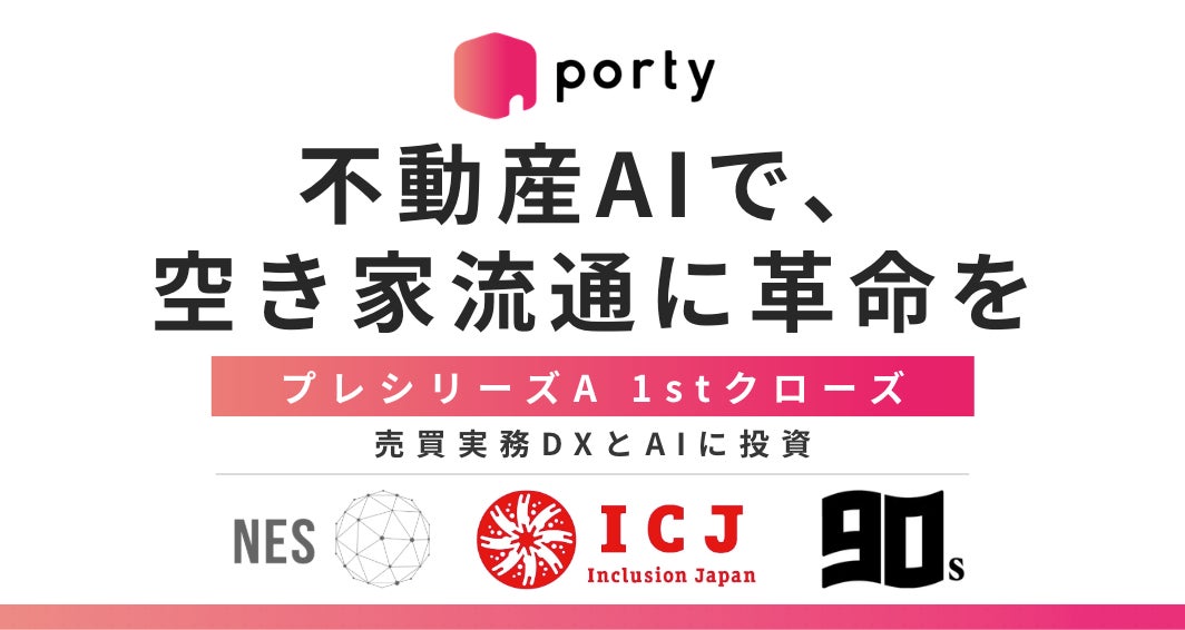 どんな家でも売り買いできる不動産フリマアプリ「ポルティ空き家バンク」およびAI賃料査定サービスを運営する株式会社ポルティ(本社:神奈川県川崎市多摩区、代表取締役:平瑶平、以下「ポルティ」)は、NES株式会社(代表取締役:今川信宏)が運営するNES投資事業有限責任組合、インクルージョン・ジャパン株式会社が運営するICJ2号ファンド投資事業有限責任組合(代表取締役:服部結花)、90s1号投資事業有限責任組合(代表パートナー:国本帆高)を引受先とする第三者割当増資により、プレシリーズAラウンド(1stクローズ)として総額8,500万円の資金調達を実施したことをお知らせいたします。