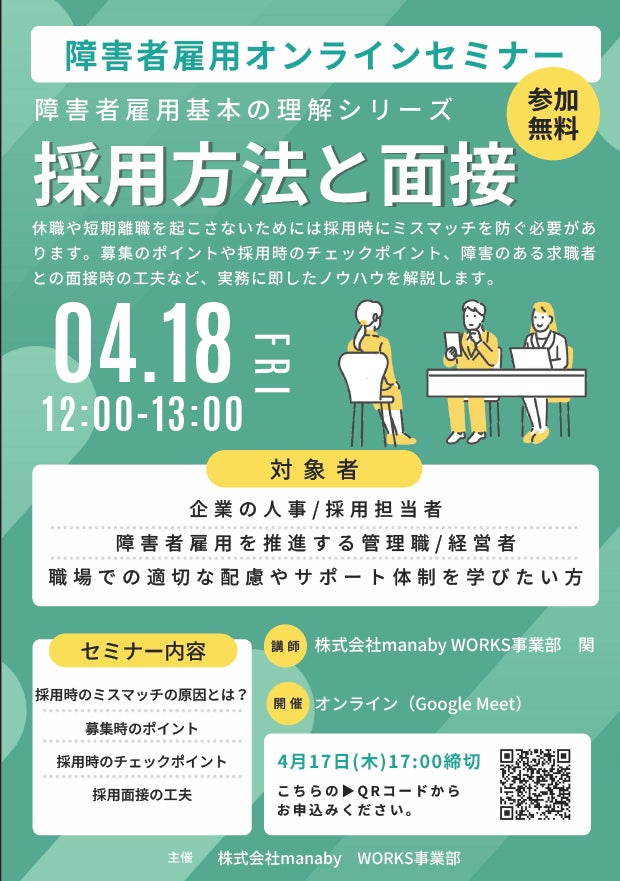 就労支援事業を行う株式会社manaby(本社:宮城県仙台市、代表取締役社長:岡﨑 衛)は、企業向けオンラインセミナー「障害者雇用 基本の理解シリーズ 採用方法と面接」を開催します。