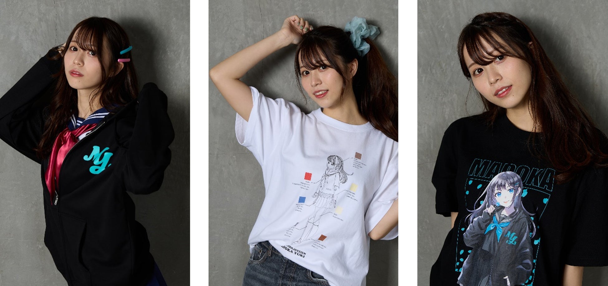 結城まどかを演じる声優・若松来海さんを本コラボアパレルの着用モデルに起用しています。若松さんのアイテム着用写真は各コラボアパレルアイテム商品ページ内にてご覧いただくことができます。