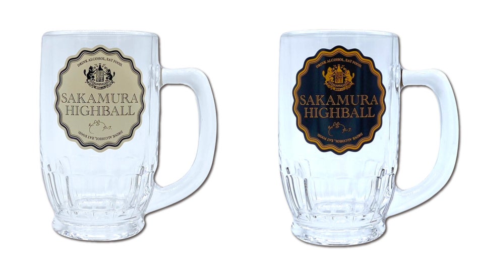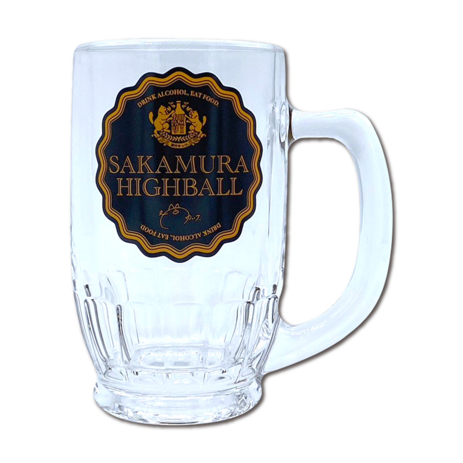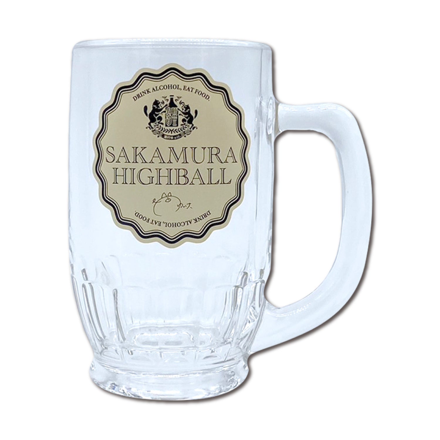 「酒村ゆっけ、」さんのサインイラストがプリントされたハイボール用ジョッキ。