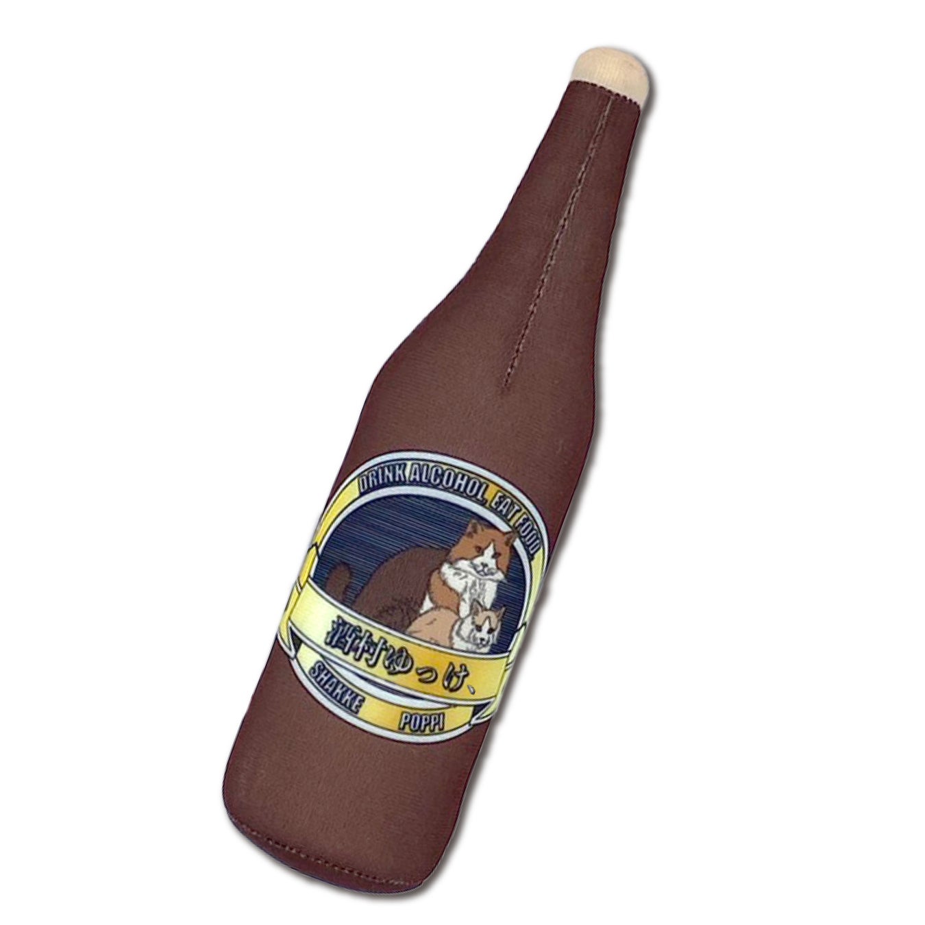 飼い猫の「しゃっけ、」「ぽっぴー」のイラストが描かれた瓶ビール型ぬいぐるみ。