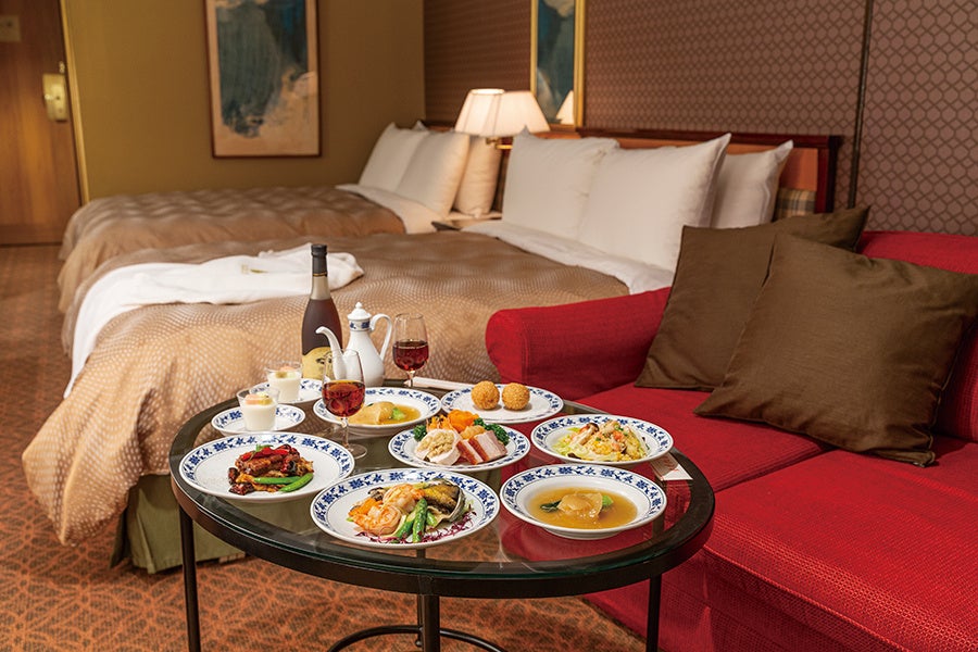 プライベートな空間でお食事をお楽しみいただける「ルームサービス」。ホテル併設、中華四川料理「重慶飯店 新館」のコース料理を、ご希望の時間にお部屋にお届けいたします。プライベートな時間をプライベートな空間でゆったりとお寛ぎください。