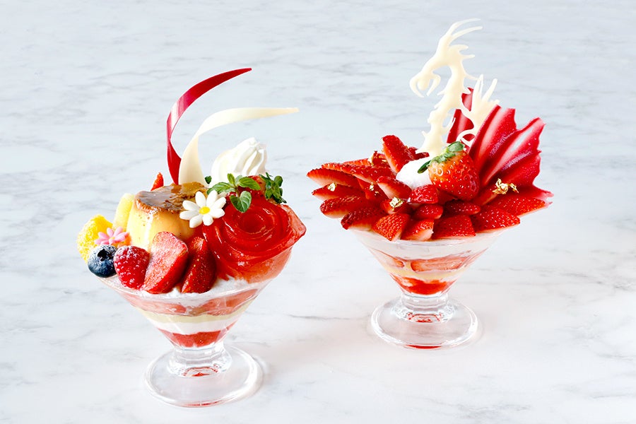 新年に贅沢なパフェはいかがですか。溢れんばかりの苺を使ったドラゴンパフェと、りんごで作る赤いバラが華やかなローズパフェをご用意しております。