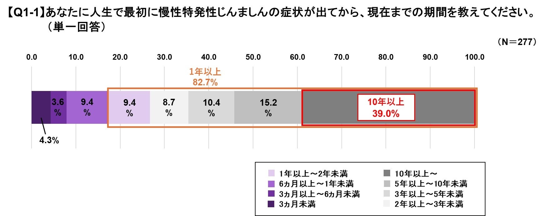 1.慢性特発性じんましん患者さんのうち、約4割が人生で最初に症状が出てから現在までの期間が「10年以上」と回答。4人に1人は「ほぼ毎日症状が出続けている」