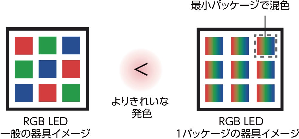 光の三原色が最小パッケージによって混色することで、器具から照射される光が色むらなくきれいに発色します。