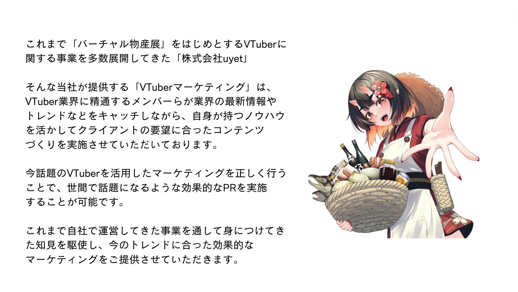 VTuber、IP コンテンツを通して日本と世界で新たな流通を生み出す「IP コンテンツの総合商社」株式会社uyet(本社:東京都渋谷区、代表取締役:金井洸樹・梶田大樹)は、企業・自治体向けのVTuberマーケティングサービスを開始させていただきます。uyetでは「バーチャル物産展」や「まちスパチャプロジェクト」などの多数の事業を展開しており、その中で知り得た知見を活かしてクライアントのご要望に合わせた「VTuberマーケティング」をご提供させていただきます。