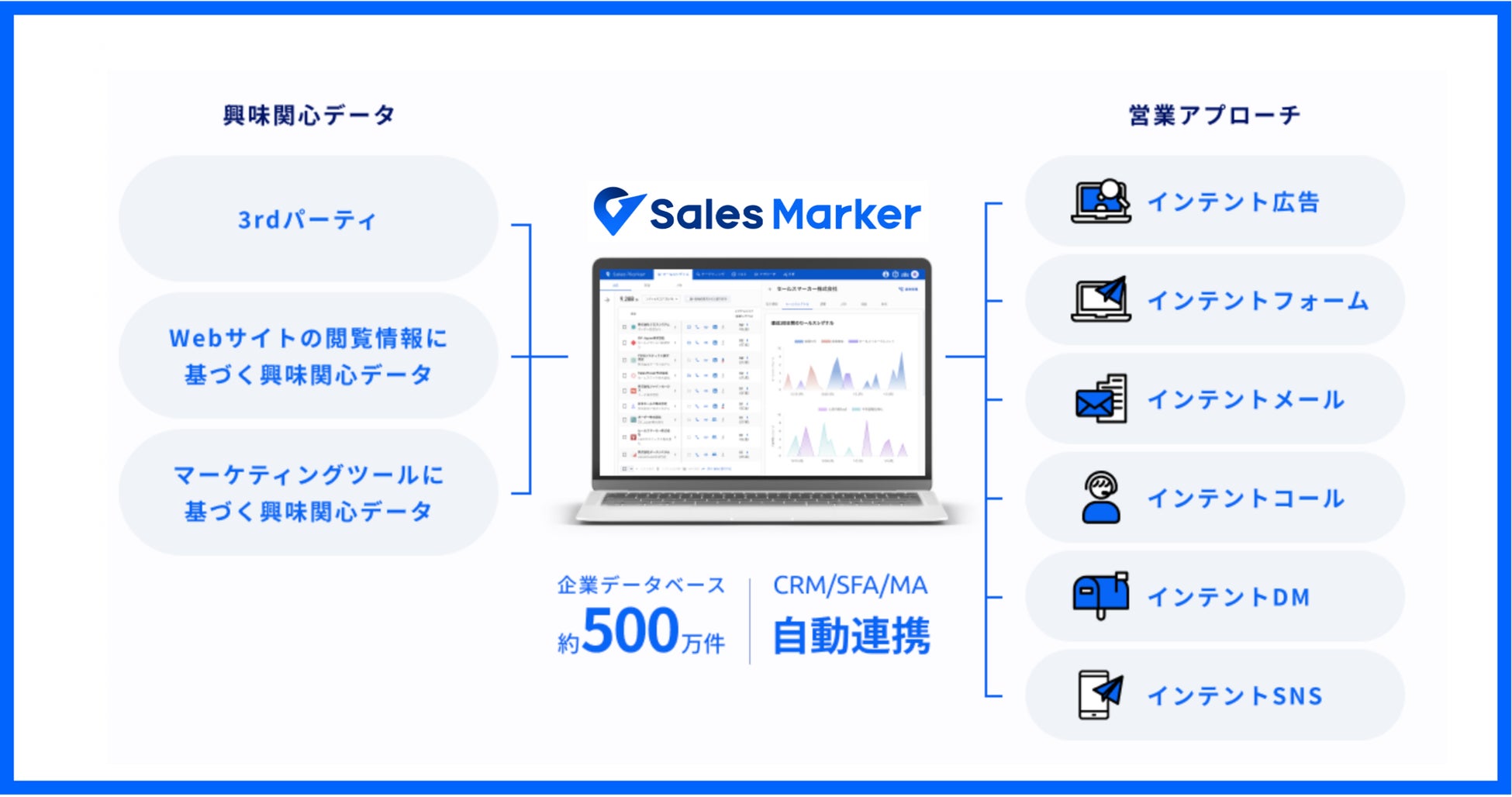 「Sales Marker」は、約500万件の法人データベースと企業のインテントデータを組み合わせる事によって、今まさに自社のサービスを求めている企業を見つけ出し、キーマンに直接アプローチすることができるインテントセールスSaaSです。