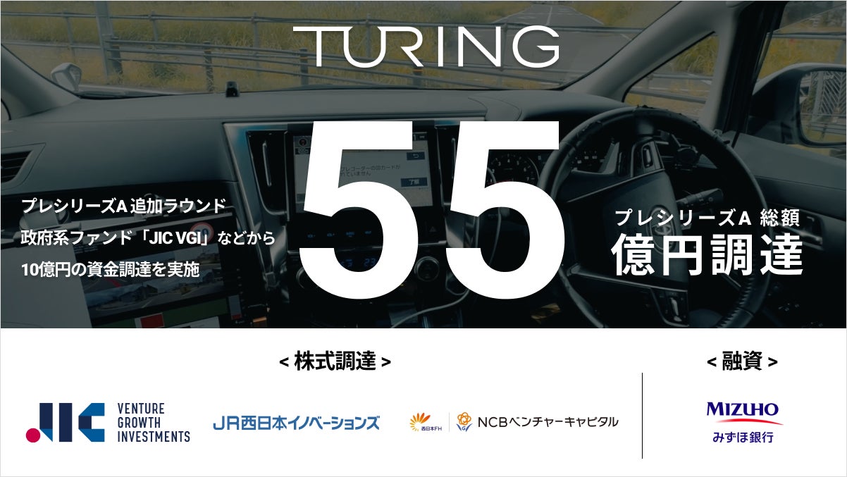 Turing株式会社(東京都品川区、代表取締役:山本 一成、以下「チューリング」)は、JICベンチャー・グロース・インベストメンツ、JR西日本イノベーションズ、NCBベンチャーキャピタル、および当社CFO 盛島正人による8.2億円の株式調達に加え、みずほ銀行から2億円の融資を受け、プレシリーズA 追加ラウンドとして10.2億円の資金調達を完了したことをお知らせします。これにより、プレシリーズAラウンドの調達金額は総額55.58億円となります。