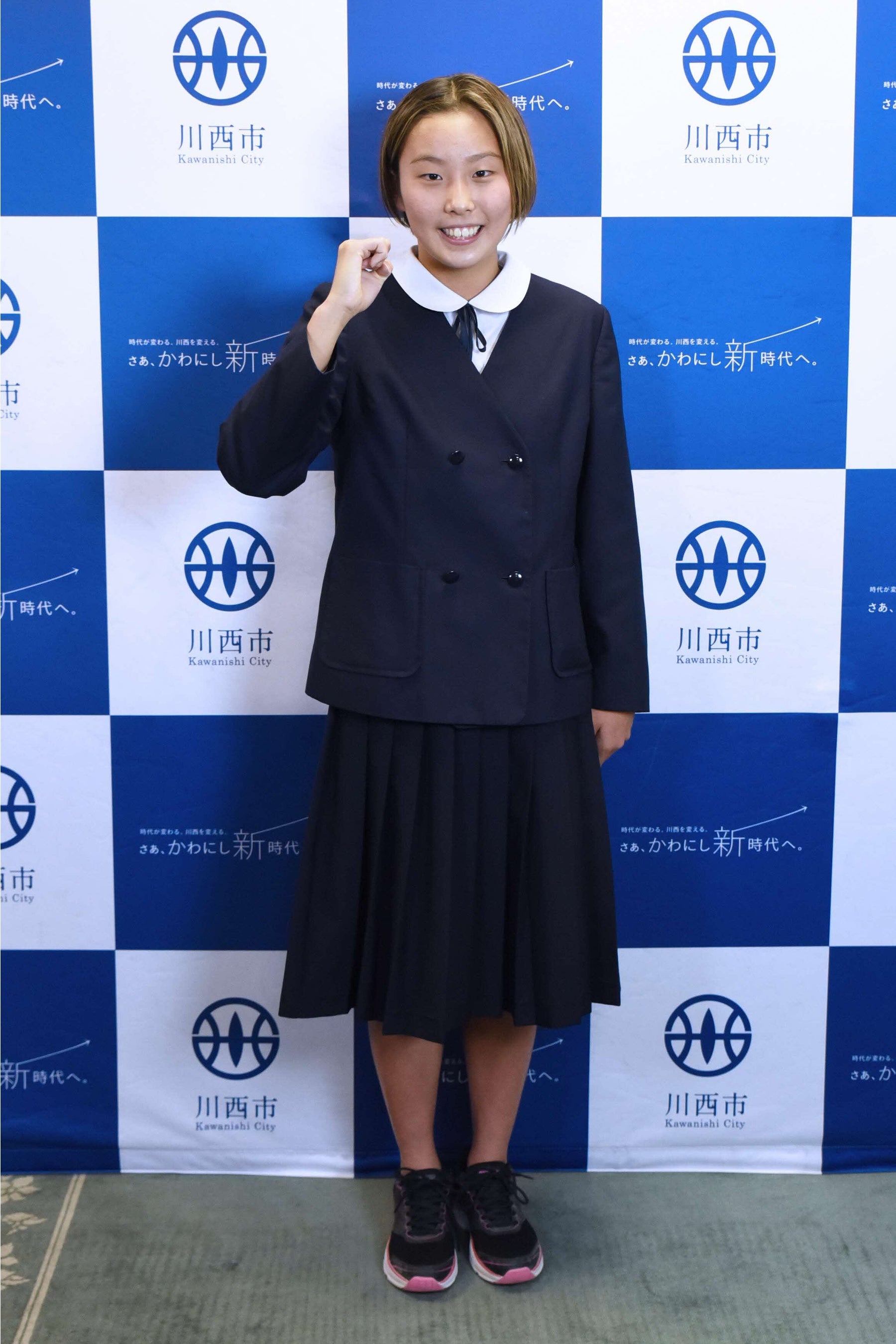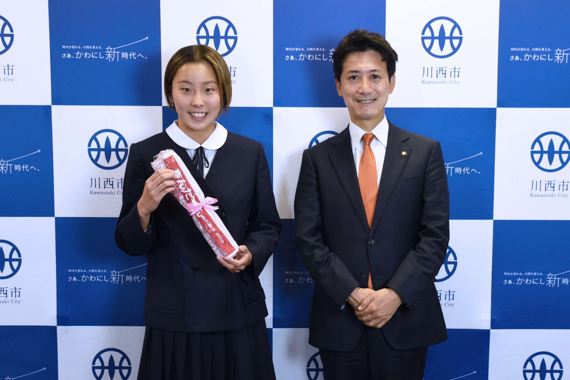 26日、県中学校選手権水泳競技大会の優勝と全国中学校選手権水泳競技大会に6位入賞した小林愛茉さん(こばやし えま 東谷中学2年生)が川西市役所を訪問。試合を振り返り、越田謙治郎川西市長に今後の抱負などを語った。