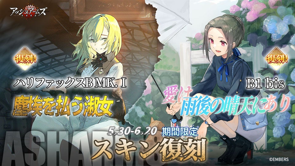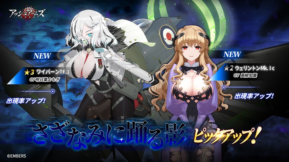 開催期間中、「さざなみに踊る影」召集で新登場DOLLS★3 軽攻撃機「ワイバーンTF.1」(明日葉よもぎ)、★2 中爆撃機「ウェリントン Mk.Ⅰ」(高柳知葉)がピックアップされ確率アップします。