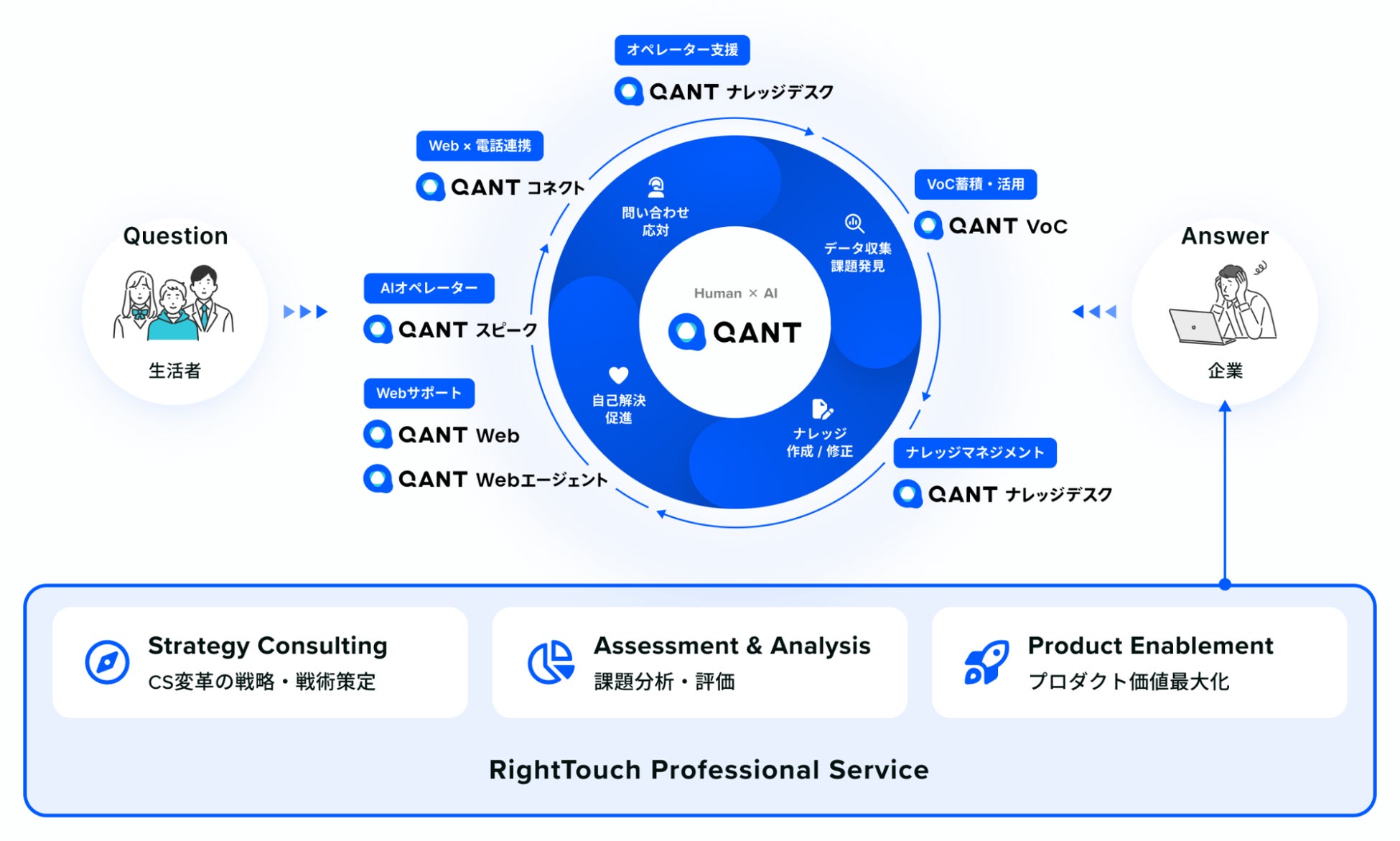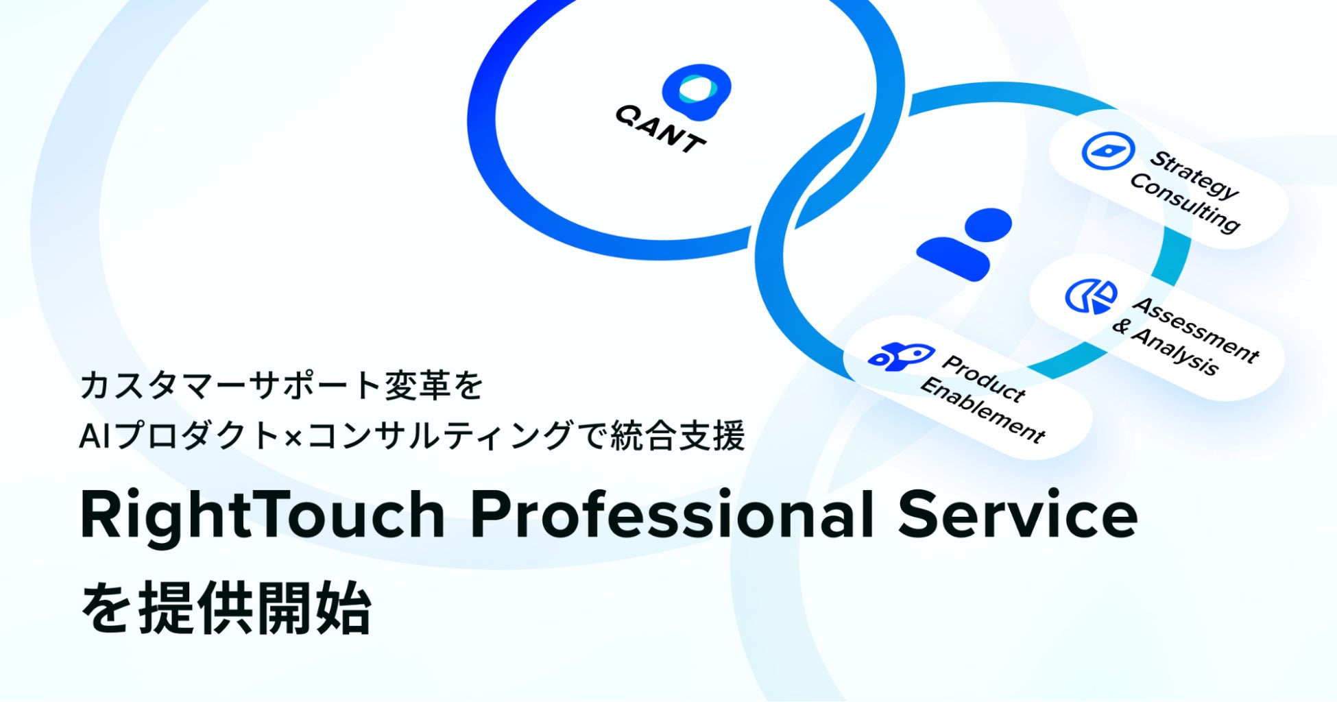 RightTouchはこのような状況に対し、カスタマーサポート領域に深く根ざした知見とAIプロダクト「QANT」シリーズで培った実績を活かし、AI戦略の立案から実装・グロースまでを一気通貫で支援する「RightTouch Professional Service」の提供を開始します。企業がAIを前提にカスタマーサポート戦略を再構築する中で、部分最適のAI導入では越えられない“全体変革”を実現する伴走型サービスとして、カスタマーサポート領域からAI本格実装を推進し、企業の持続的な事業成長・事業変革に貢献してまいります。