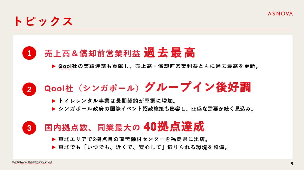また、シンガポール政府の国際イベント周知施策も影響し、今後も旺盛な需要が続く見込みです。なお、現地にはASNOVAスタッフが常駐し、PMIも順調に進捗しております。そして、2025年8月に東北エリアで2拠点目の直営機材センターを福島県に出店いたしました。これにより、国内拠点数が同業最大の40拠点を達成いたしました。