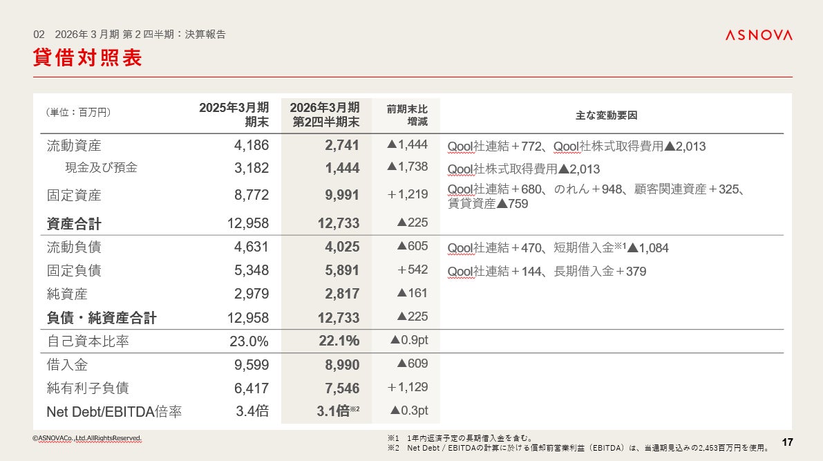 前期末比で現金及び預金が大きく減少した原因は、Qool社の株式取得費用の支払いによるものです。資産合計は前期末比で2.2億円の減少となりました。