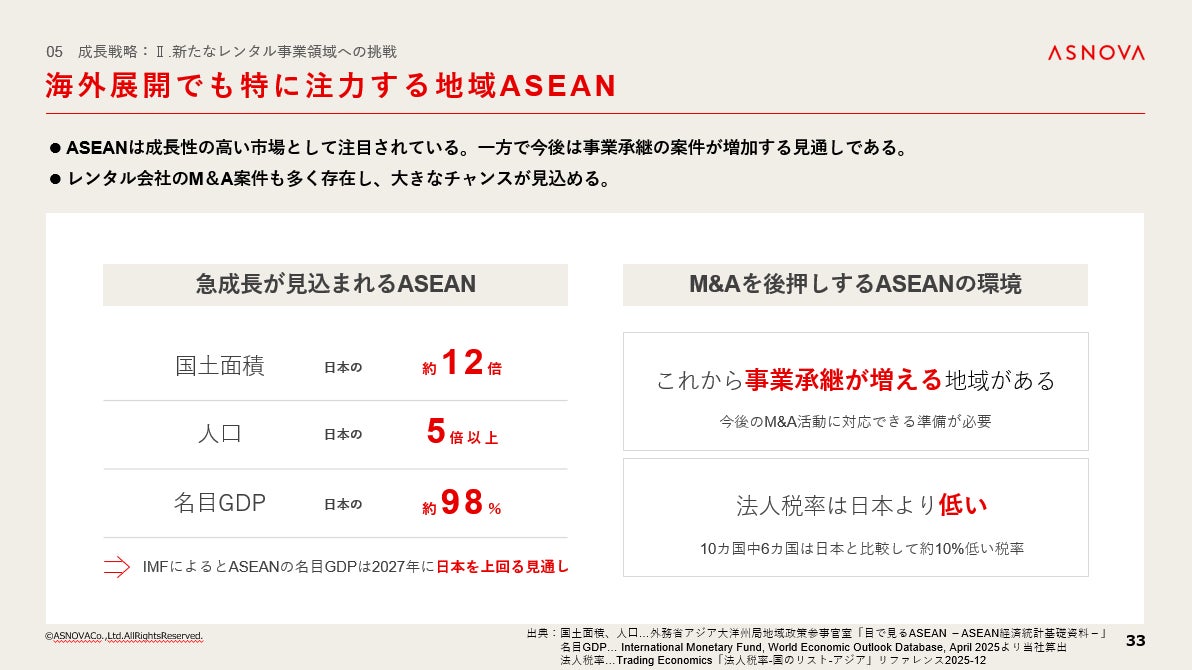 こうした背景から、当社にとってASEAN地域でのM&Aは、大きな成長のチャンスであると捉えており、積極的に検討・推進してまいります。