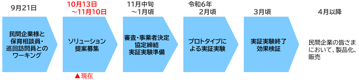 9月21日に開催したワーキングの内容を踏まえ、課題解決のための実証実験の実施に向けたソリューション提案募集を行います。実証実験に参加いただいた民間企業の皆さまには、実証実験の結果を踏まえて、製品化・販売に向けて取り組んでいただきます。