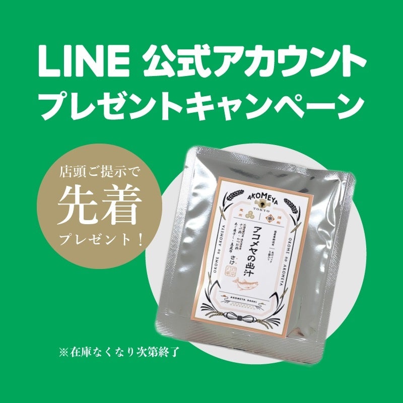 AKOMEYA TOKYO公式LINEアカウントを友だち追加してその画面を店頭スタッフにご提示いただいたお客様に「アコメヤの出汁(さけ)」を1包プレゼント!