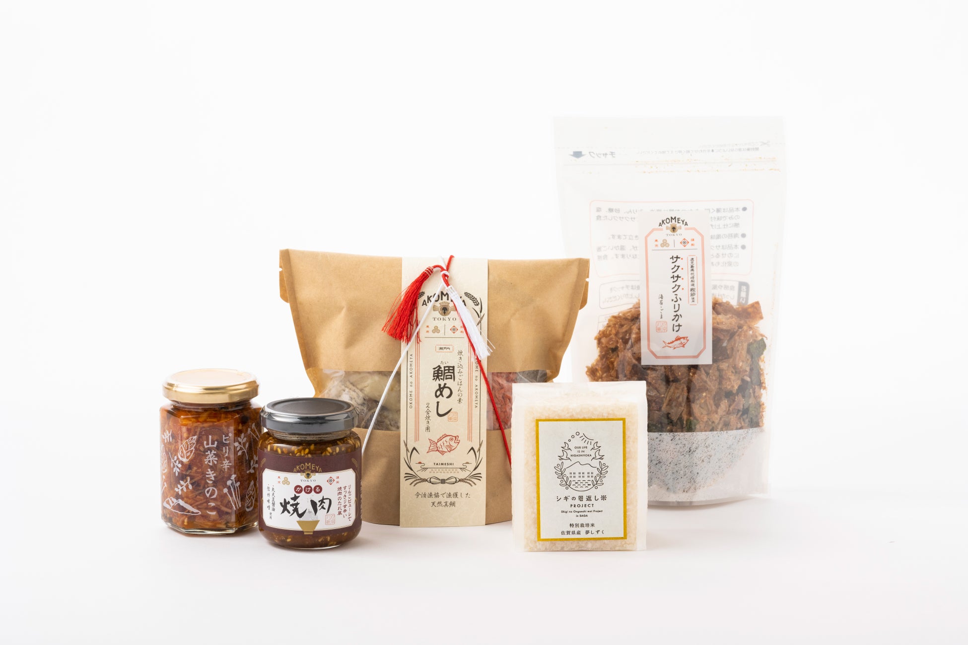 ・内容:人と田んぼと生きもの、そして美しい自然が共生しながら持続可能な農業を目指す、“シギの恩返し米プロジェクト”で生産された佐賀県佐賀市産の「特別栽培米 夢しずく」、渦潮育ちの自慢の鯛を贅沢に使った人気NO.1の「炊き込みご飯の素 鯛めし」などアコメヤの売れ筋商品をひとまとめにしたスペシャルセット