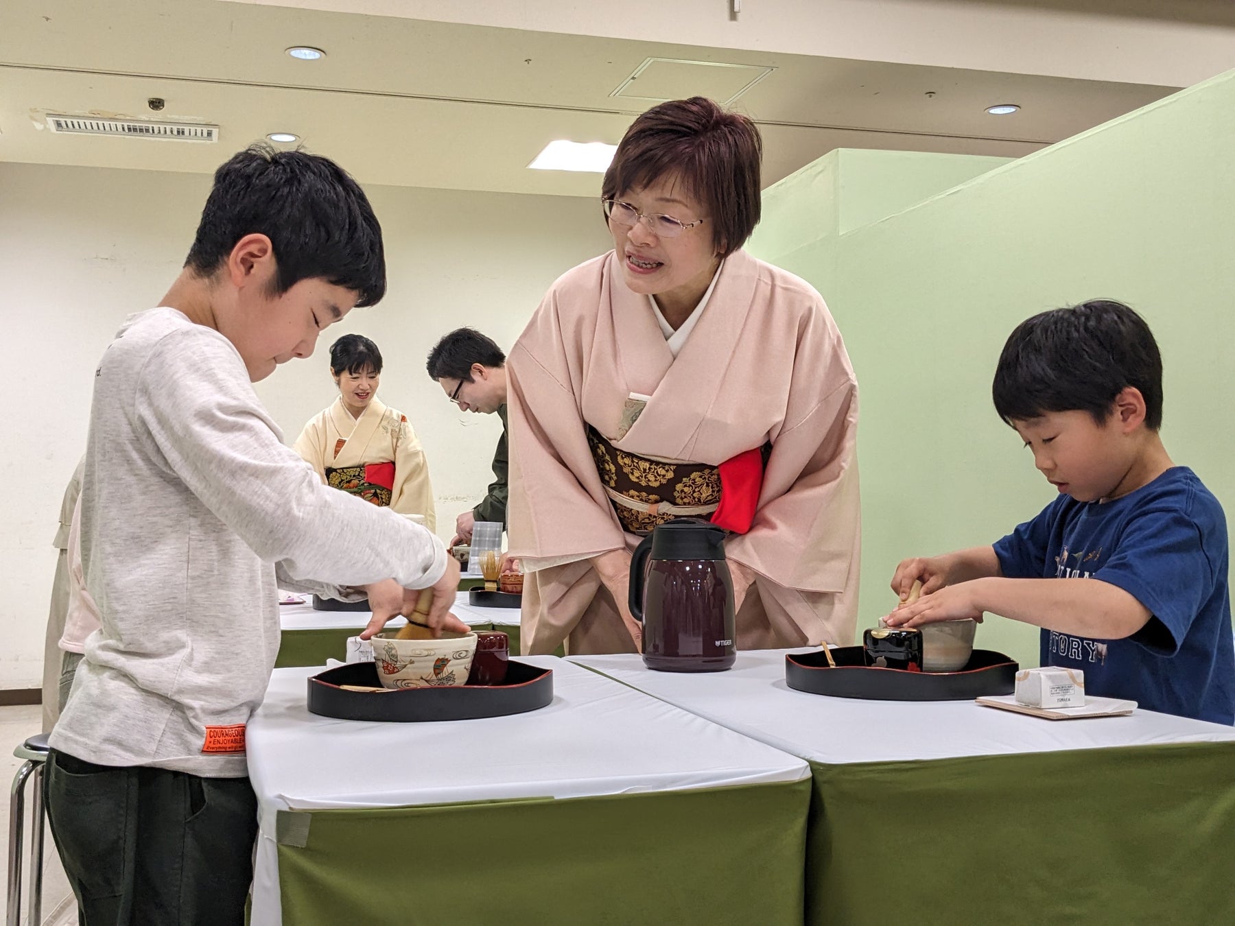 席主と呼ばれるホスト役の先生と裏方さんが、お道具を選んだり、掛け軸はこれで、お花はこれで…準備段階からお客様を思いながら、一つ一つこだわってしつらえます。お茶のお作法がわからなくても、不安があっても大丈夫です。昨年に続いて初心者向けの「お点前体験席」を今年も行います。お茶のいただき方やたて方の基本を学ぶことができます。