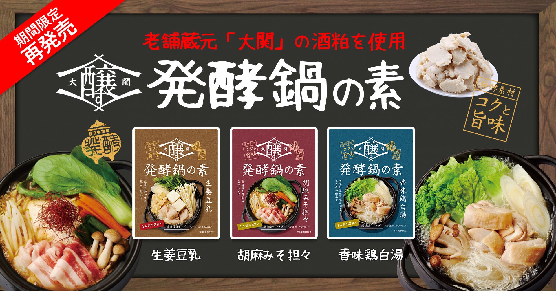 手軽に本格的な発酵鍋が楽しめる『大関醸す(かもす) 発酵鍋の素』シリーズより「生姜豆乳」「胡麻みそ担々」「香味鶏白湯」が期間限定で再発売