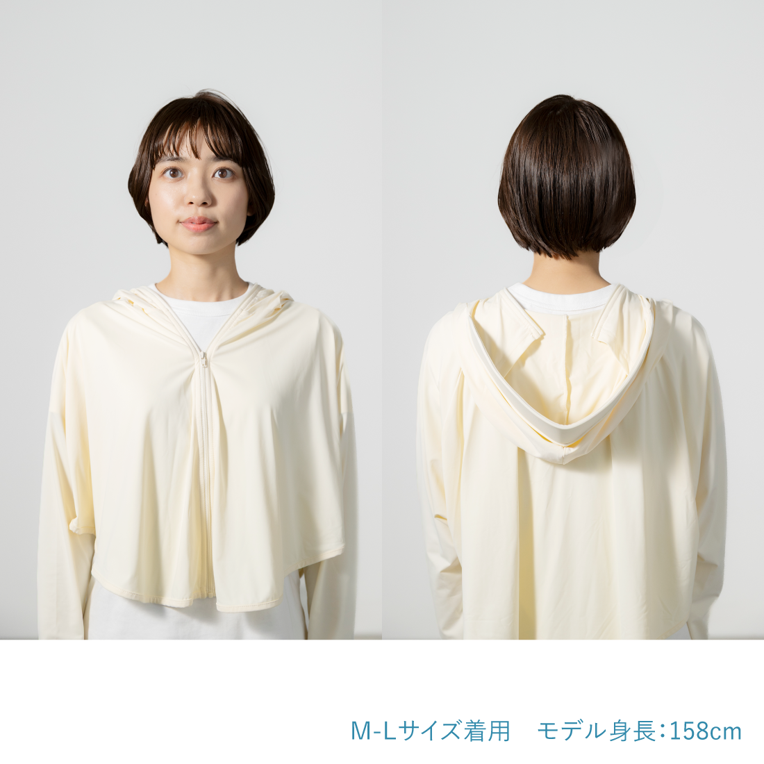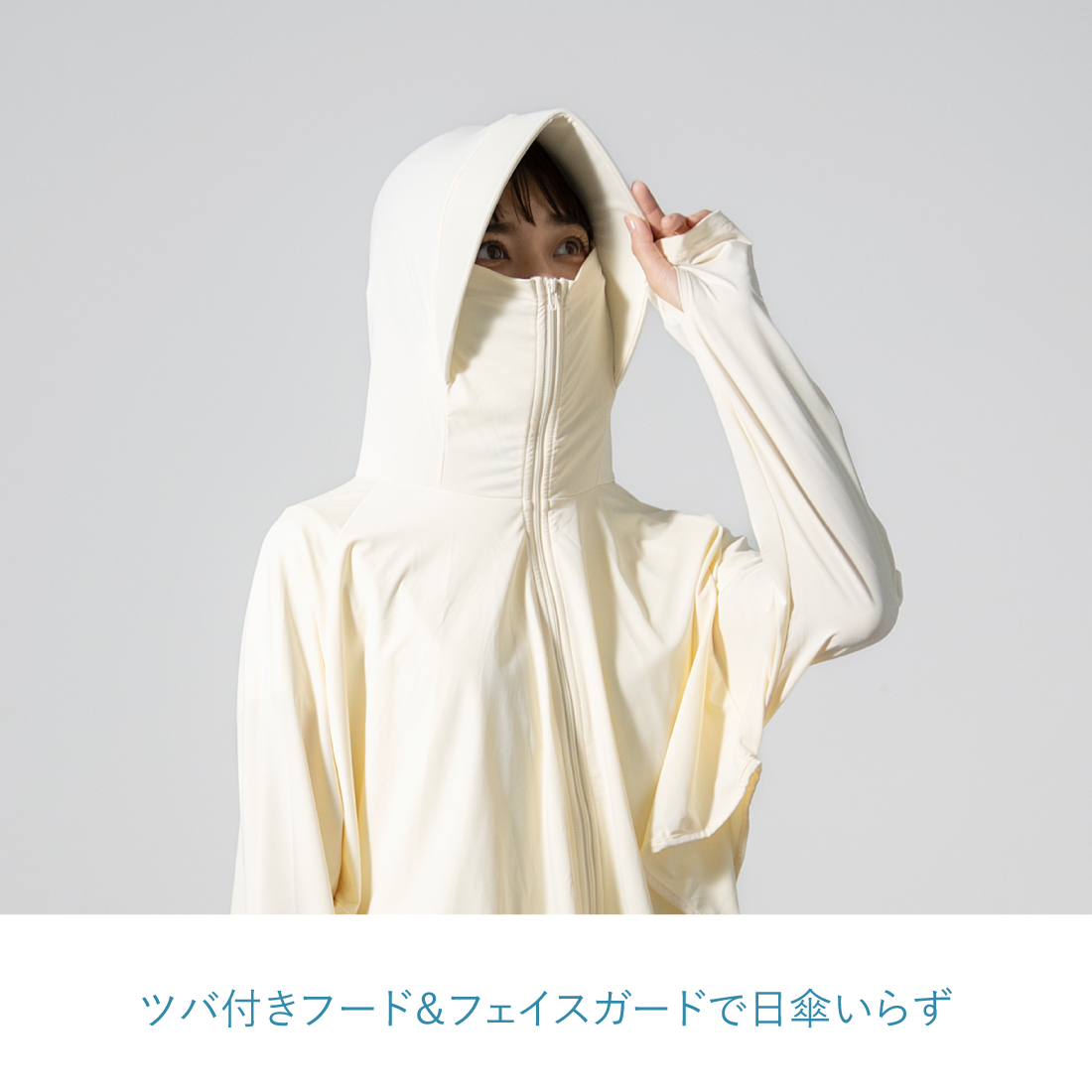 忙しい朝も「着るだけ」でUV対策が完了する優秀アイテム。帽子・フェイスカバー・アームカバー・パーカーの役割を1枚にまとめて、頭から顔、首、腕までしっかりカバーします。ツバ付きフード&フェイスガードで日傘いらずです。