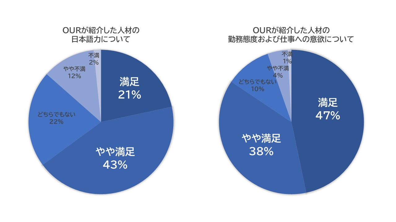 2024年5月末に実施した顧客満足度調査(無記名アンケート調査)によると、OURが紹介した人材に対する「日本語能力」および「勤務態度および仕事への意欲」について高い評価を得ています。