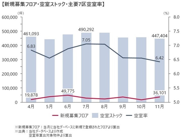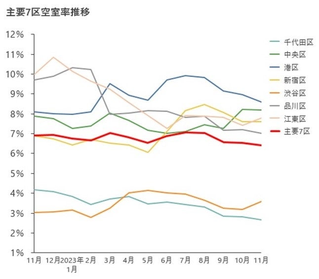 <2023年11月末時点>東京主要7区 オフィスビル空室率・平均募集賃料調査