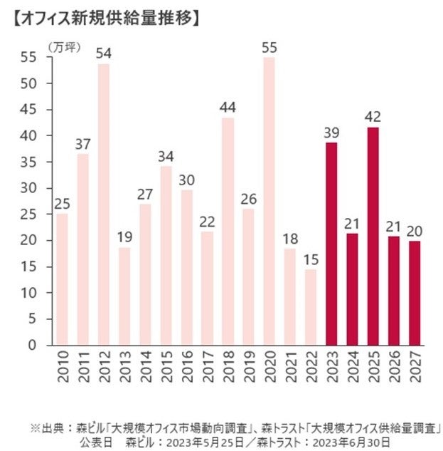 ・調査対象ビルは当社社内データに登録されているビル、且つ、千代田区、中央区、港区、新宿区、渋谷区、品川区、江東区に調査時点で竣工している延床3,000坪以上のテナントビルを対象としております。