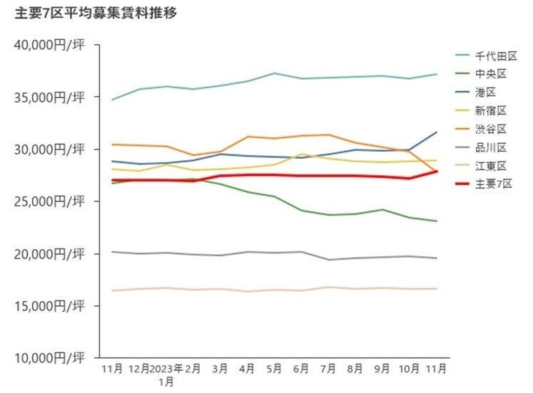 2023年11月末時点の主要7区の空室率・平均募集賃料の動向