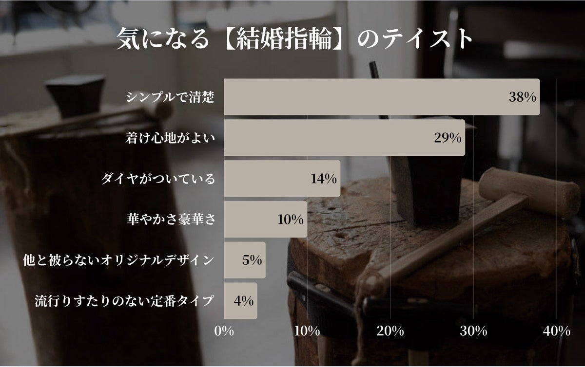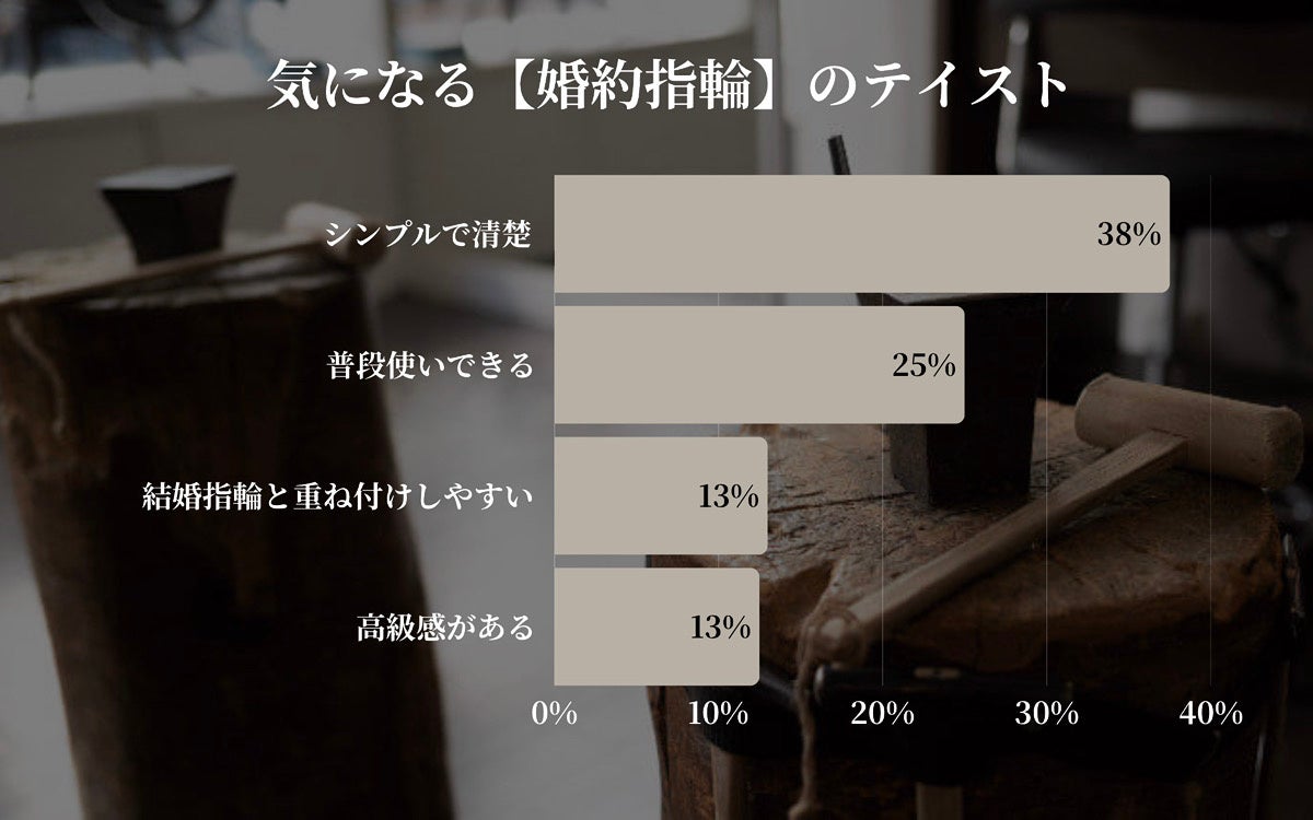 結婚指輪においても「シンプルで清楚」が最多の38%を占め、日常的な着け心地の良さ(29%)も重視されています。華美な装飾よりも、長く愛せる飽きのこないデザインが求められている傾向です。ダイヤやオリジナリティは一定の関心を集めつつも、主軸は“日常に寄り添う上質さ”であることがうかがえます。