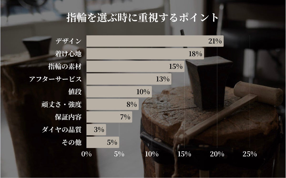 指輪選びで最も重視されているのは「デザイン」(21%)と「着け心地」(18%)で、見た目と日常使いの快適さが重要視されています。さらに「素材」や「アフターサービス」など、長く安心して使える要素も上位にランクイン。高級感や希少性よりも、実用性と愛着を持てることが選ばれる理由となっています。指輪は“暮らしの中で育てていく存在”として捉えられていることがうかがえます。