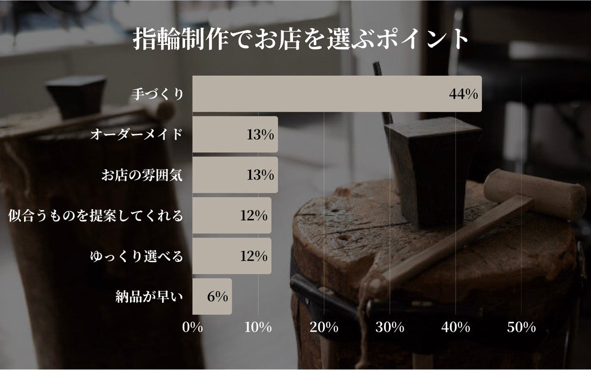 指輪制作でお店を選ぶポイントとして、「手づくり」が44%と最も重視されています。オーダーメイドや店の雰囲気なども続き、個々の体験や安心感のある接客が求められていることがわかります。単なる購入ではなく、“思い出を形にする場”として選ばれている傾向が強まっています。