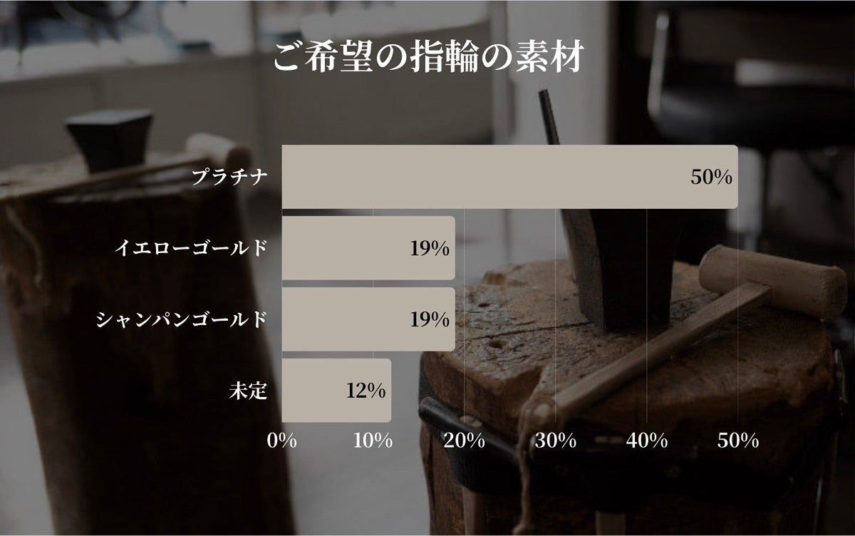 素材の希望では「プラチナ」が50%と圧倒的な支持を集めており、上品で変色しにくい点が評価されています。一方で、イエローゴールド・シャンパンゴールドも各19%と注目されており、個性を楽しむ傾向も見受けられます。定番の安心感と、自分らしさのバランスを求める声が反映されています。