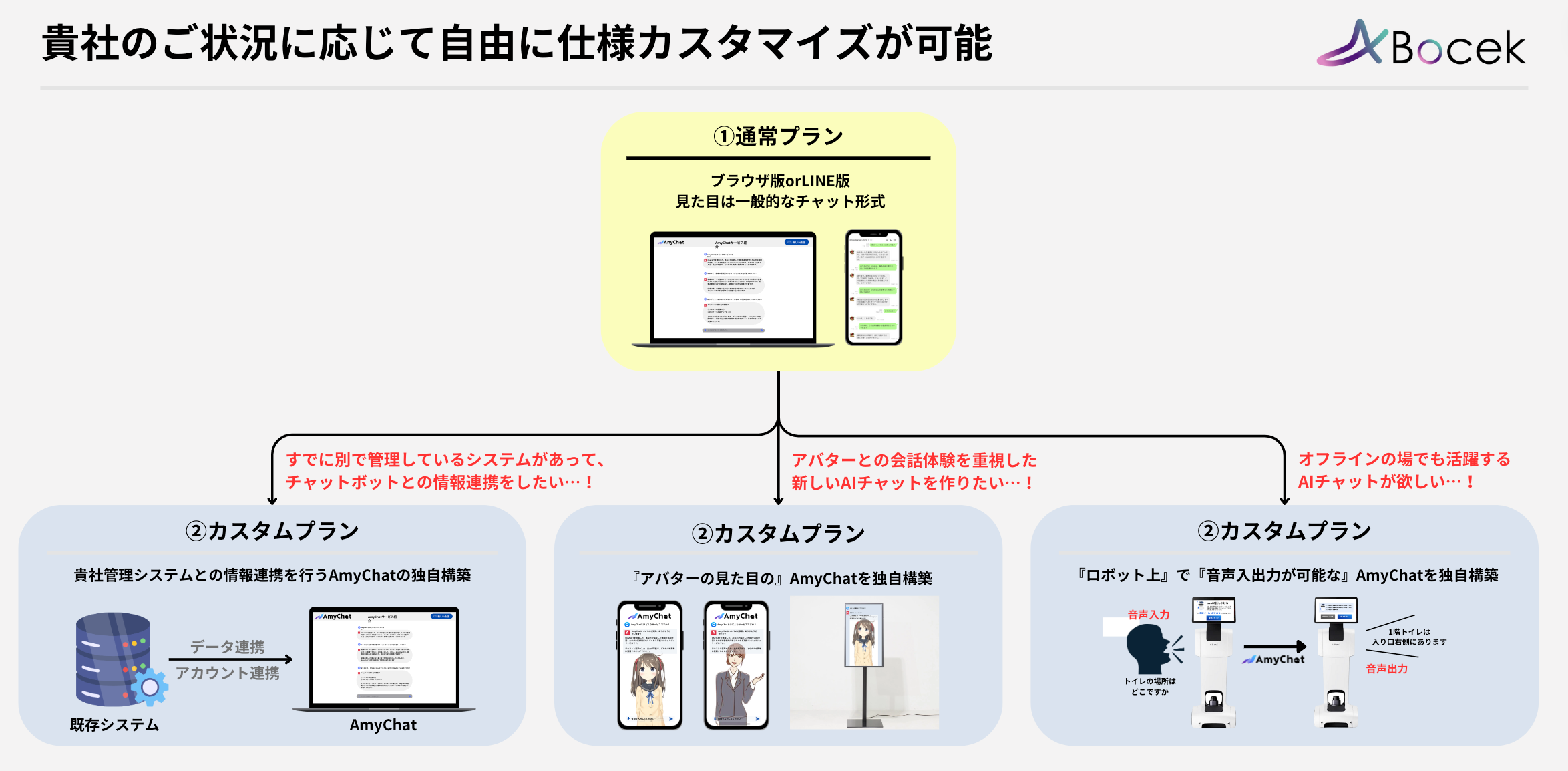 また、安価で即座に導入可能な通常プランに加えて、お客様のご状況に合わせて仕様をカスタマイズする「カスタムプラン」で柔軟なチャットボットの構築も可能です。