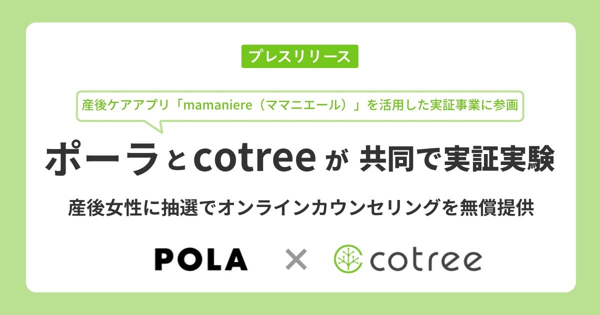 オンラインカウンセリング・コーチングの「cotree」を展開する株式会社cotree(本社:東京都港区、代表取締役:西岡 恵子、以下cotree)は、株式会社ポーラ(本社:東京都品川区、代表取締役:及川美紀、以下ポーラ) が提供する産後ケアアプリ「mamaniere(ママニエール)」を活用した実証事業に参画し、オンラインカウンセリングによる産後女性の心のサポートを、2023年12月末まで無料で行います。なお本実証事業は、経済産業省「令和5年度フェムテック等サポートサービス実証事業費補助金」に採択されています。