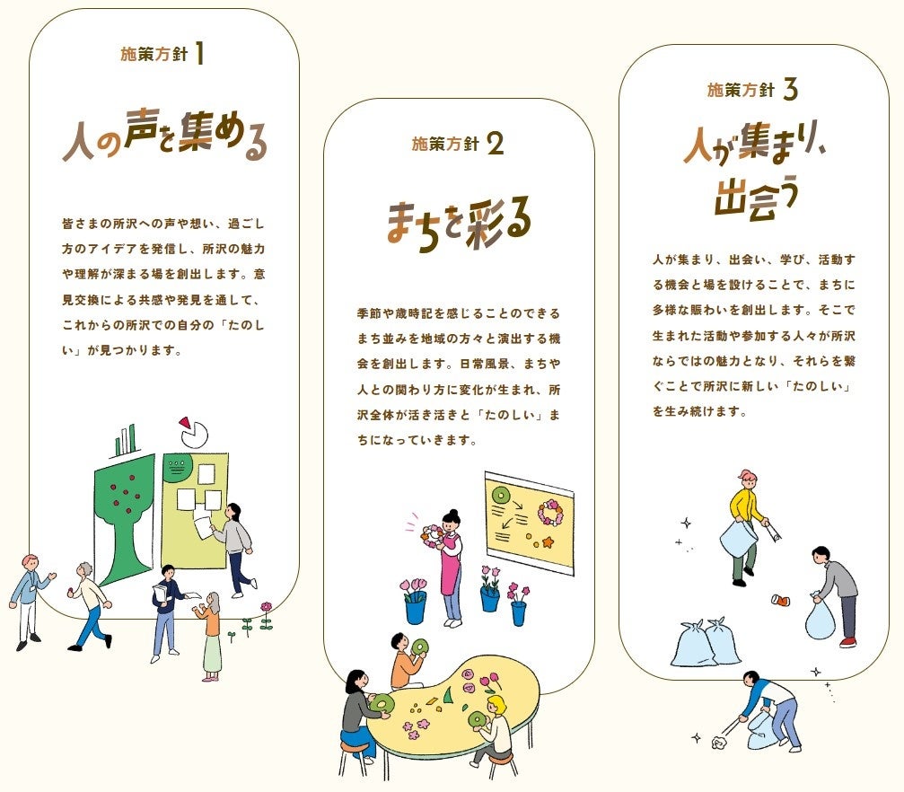 『所沢タウンマネジメント』では、「声を集める、まちを彩る、集まり出会う」を施策方針として、さまざまな施策を実施してまいります。
