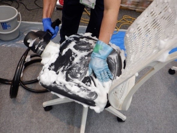 テーブル等は拭きやすいため清潔を保つことができますが、毎日座るチェアは清掃されずに使い続けられることがほとんどです。埃や食べこぼしによる汚れ、特に手あかなどの皮脂汚れが蓄積していくので、3 年ほど使用したチェアは洗浄した際の⽔が真っ⿊になります。働き方の見直しによりフリーアドレス席を導入する企業が増えている昨今、不特定多数の人が座るチェアの汚れは社員のモチベーションにも影響を与える可能性があり、定期的にクリーニングをすることで美観と衛生面の改善ができ従業員に喜ばれる労働環境へとつながると考えています。