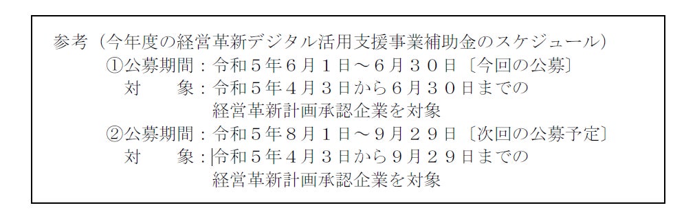 この度、令和5年4月3日から6月30日までに経営革新計画の承認を受けた(又は受ける見込の)事業者を対象とした公募を6月1日(木)から開始いたします。