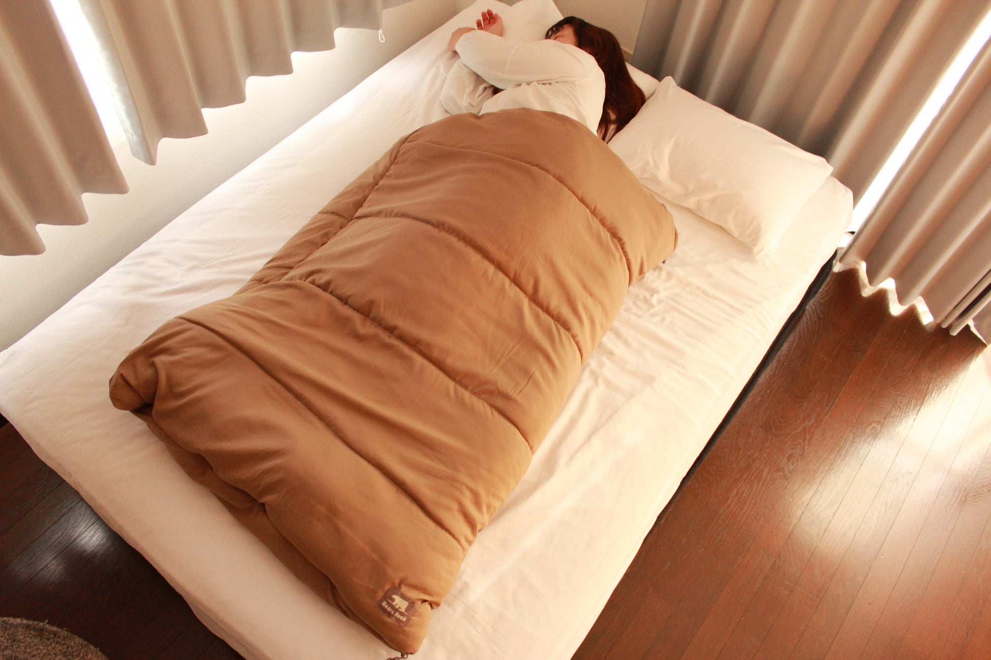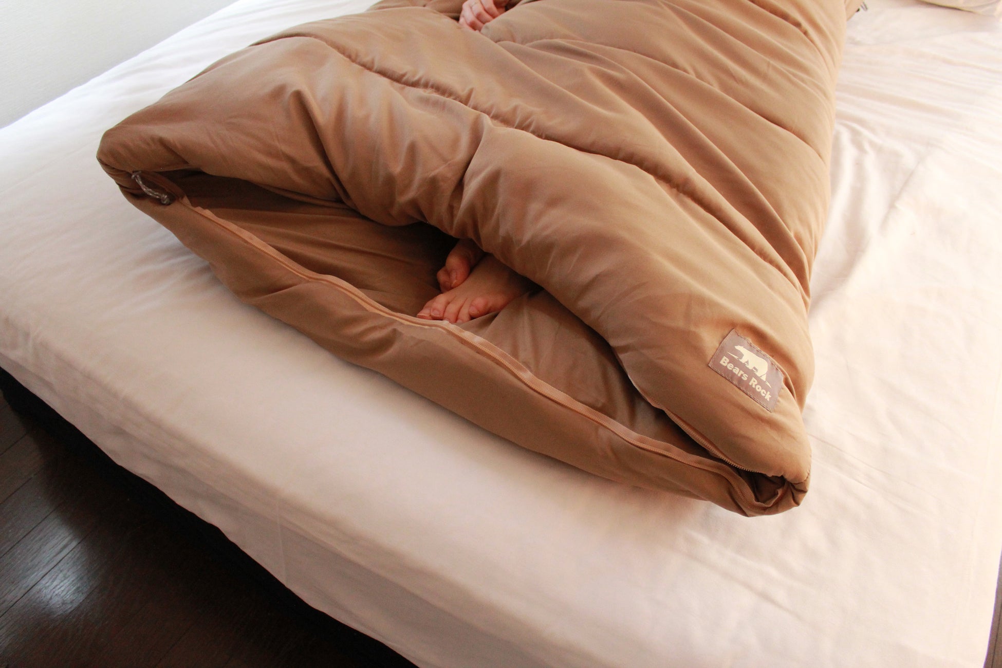 足ほっとねぶくろんに入り、その上から掛布団をかけて就寝してください。足元にファスナーがあるので、温度調節することもできます。