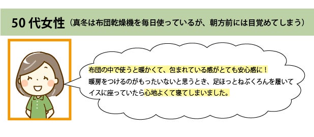 「足ほっとねぶくろん」をベッドの上に置き、その中に入り、上から布団、毛布とかけました。 あと、1人でテレビを見ているだけで暖房をつけるのがもったいないと思うとき、足ほっとねぶくろんを履いてイスに座っていたら心地よくて寝てしまいました。 布団の中で使うと暖かくて、包まれている感がとても安心感につながってかぶるんと併用すると冬が怖くない!