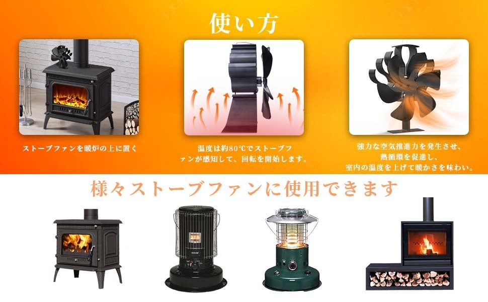 【6つブレード】ストーブファンのブレードには2カ所の折り曲げたデザインがあり、折り曲げ角度は約25度で風量が強いです。ブレードの中心を効率的に活用して風を集めます。空気抵抗を減らして、風速の変動幅も小さく、バランスの取れた“穏やかな風“を送らせます。そして、風量がち強くて、四つや五つのブレードより、6つのストーブファンの熱がもっと効率的に使えます。