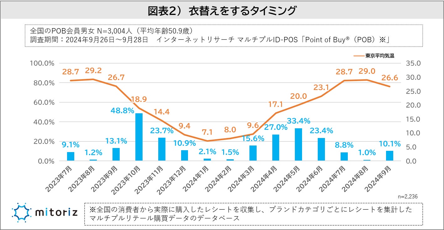 株式会社mitoriz(本社:東京都港区、代表取締役社長:木名瀬博)は、消費者購買行動データサービス「Point of Buy®(以下、POB)」の会員3,004人に「衣替えに関する調査」を実施致しました。