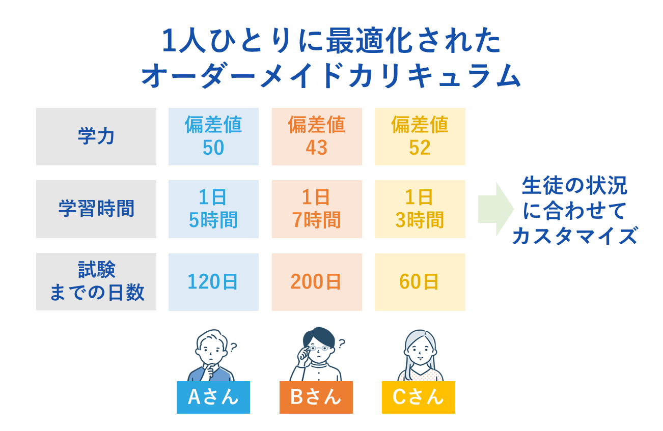 将来の進路だけを指標にするわけでなく、生徒一人ひとりの現在のライフスタイル、学習可能な時間、得意教科・不得意教科、受験希望日などに合わせたオーダーメイドカリキュラムだから生徒の多様なニーズに応えることが可能です。
