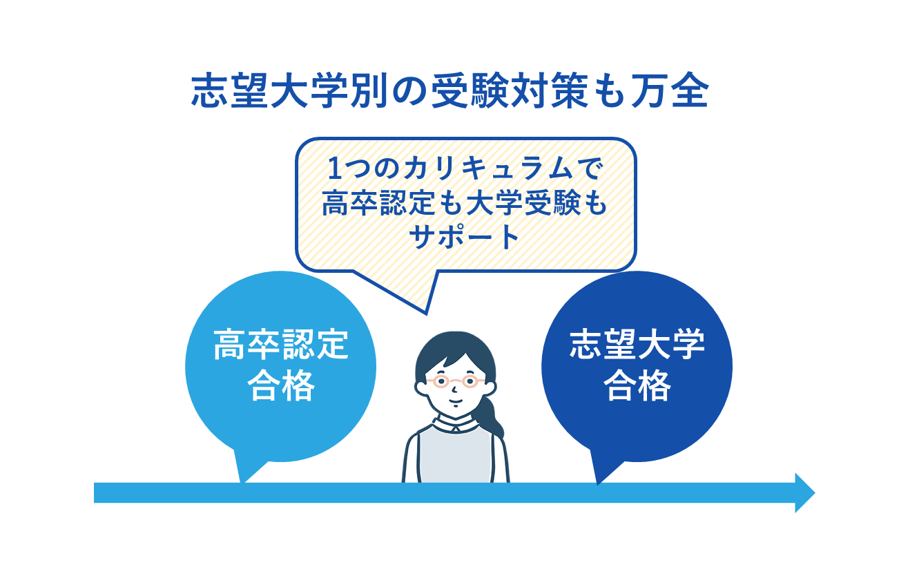 高卒認定取得後に大学進学を目指す生徒には、現在の学力から志望大学に合格する事に特化したオーダーメイド受験対策カリキュラムを提供します。高卒認定試験後の学力状況、大学ごとの入試傾向や求められる能力に応じて、最適な学習戦略を立案し、受験生を合格へと導きます。