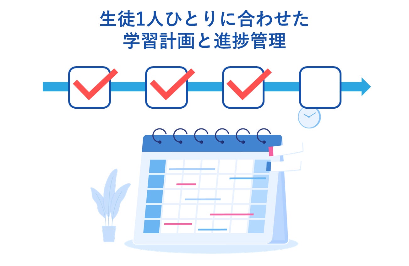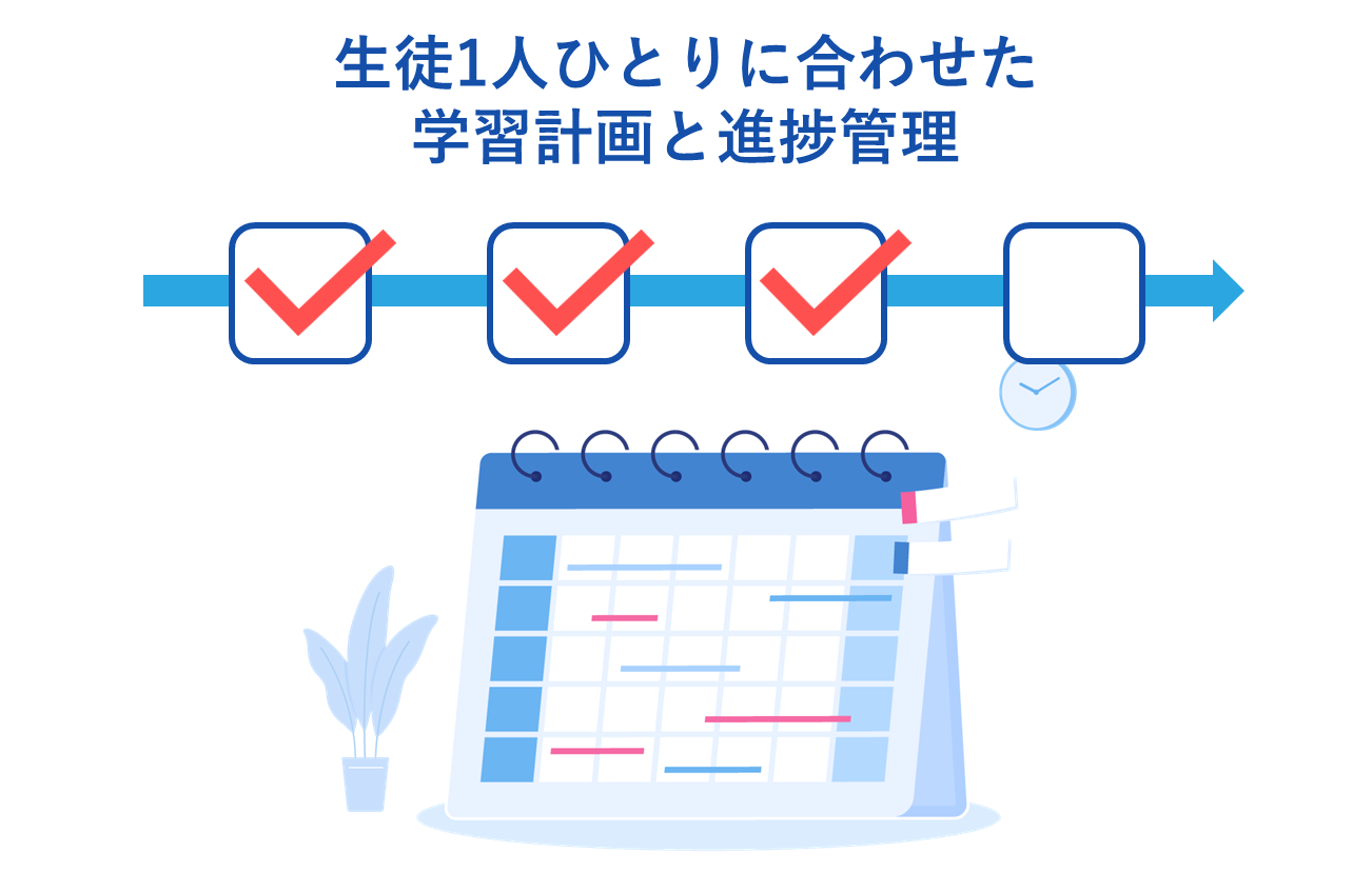 生徒1人ひとりに合わせた学習計画と進捗管理により、効率的で効果的な学習を実現します。生徒は自分で学習計画を立てる必要がないので、勉強することだけに集中できます。一人一人の学力と日々のスケジュールに合わせた学習計画を立て、定期的な進捗チェックを通じて、学習の最適化を図り合格まで導きます。