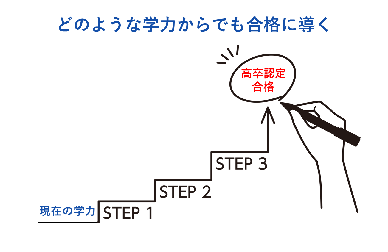 高卒認定対策コースは、中学校の学習範囲が未習、またはわからないレベルから、既に一定の学力を持つ受験生まで、幅広い学力レベルの学習者に対応しています。個々の学力レベルに合わせて、一人ひとりに最適な学習プランを提案し、それぞれの目標達成に導きます。どんな学習背景を持つ受験生でも、高卒認定合格のサポートはもちろんのこと、大学受験や専門学校の受験に必要なサポートも受けることができます。